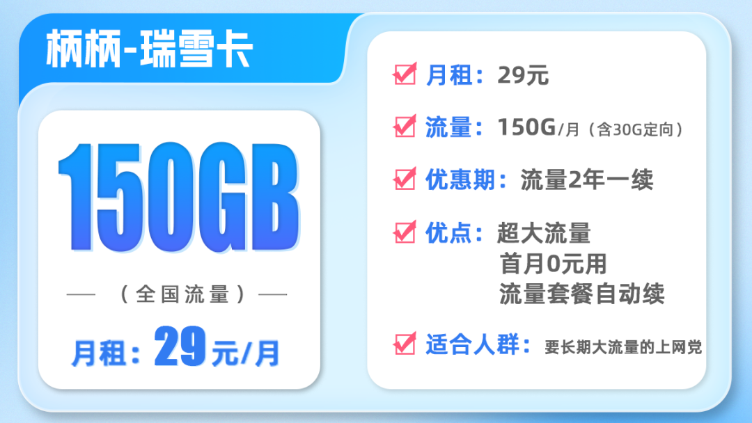在优惠期内,瑞雪卡套餐是29元150G,一张卡就能顶两张常规卡的总和,相当于直接省了一半的钱,一张卡用出两张流量卡效果。