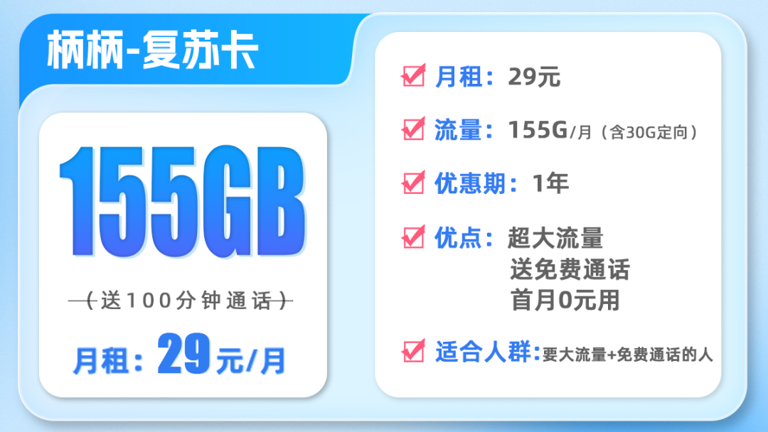 复苏卡目前凭借155G和免费通话数在好卡榜起码有一席之地,至于只有1年优惠期,柄柄建议到期后可销户,再办一张实惠的卡接着用。