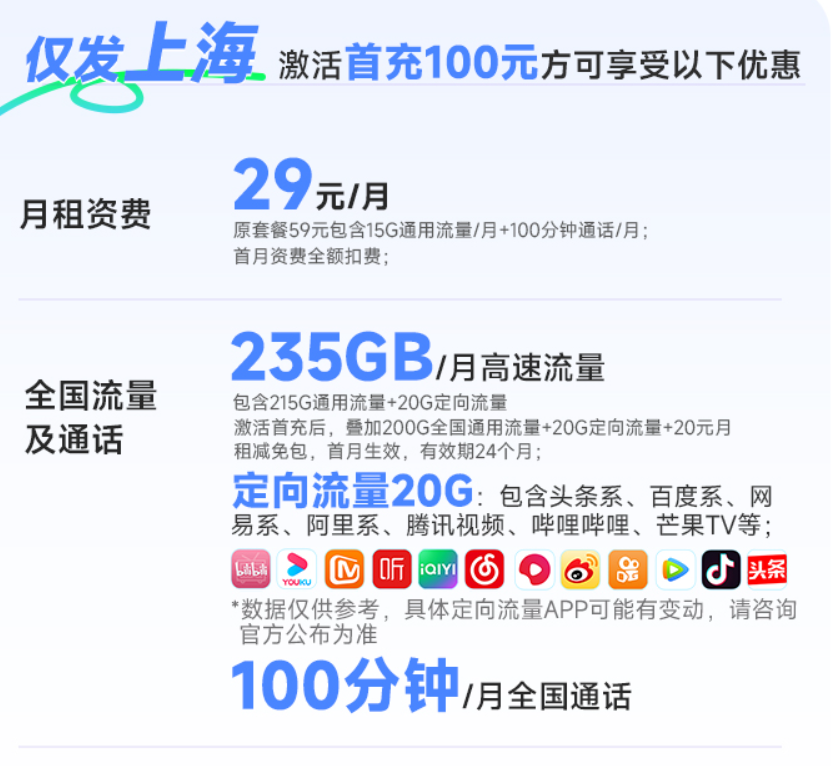 ① 不同省份套餐不一样,月租有从29-39元的,流量有从135G-235G的,可到申请页最下面看具体省份的套餐介绍。比如所处上海,就看上海的套餐。