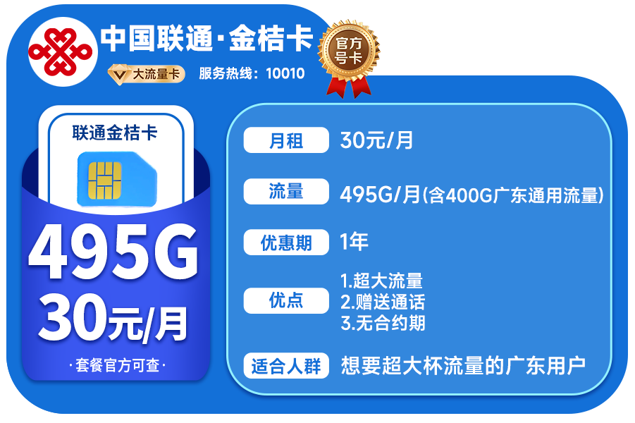 优惠套餐:30元55G全国通用+40G广东省内定向+400G广东省内通用+100分钟(第1年)